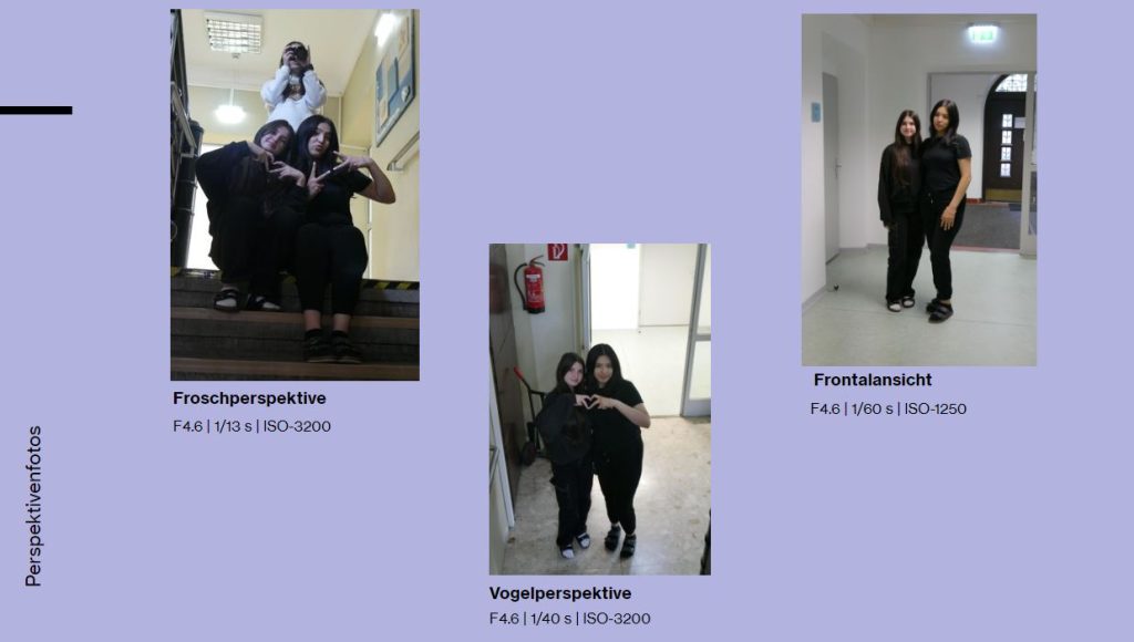 Und als letztes noch die Perspektiven. Da schaust du einfach, ob du lieber von oben fotografieren willst, also Vogelperspektive, von unten, also Froschperspektive, oder Frontalansicht.